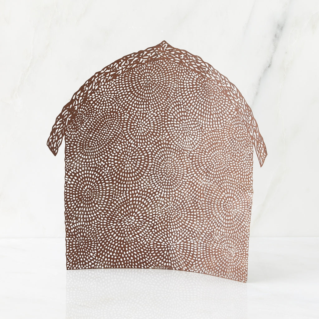 This pierced-metal backdrop was created to complement The Holy Family, though it can be used as a beautiful backdrop for other angels or figures as well. “The repetitive swirling concentric mark-making is suggestive of twinkling stars at night. The roof is an intertwined, organic structure that suggests a bower of twigs or branches. Since the surface patterning is complex with tiny elements, I wanted to pare down the form to the simplest possible. It’s basically a single sheet of pierced metal, curved to allow it to stand and represent a shelter for The Holy Family and animals.” –Susan Lordi